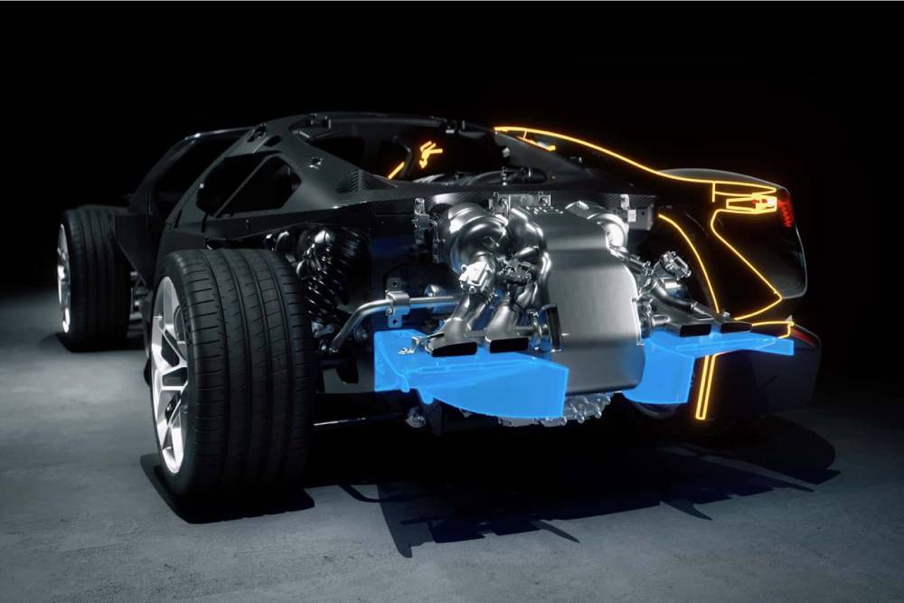 H Bugatti χρειάστηκε να κάνει τη μια μηχανολογική υπέρβαση μετά την άλλη, προκειμένου να εξελίξει και εν τέλει κατασκευάσει τη νέα Tourbillon. Ο διάδοχος της μνημειώδους Chiron κατάφερε όχι μόνο να διατηρήσει του 16 κυλίνδρους στο μηχανοστάσιο, αλλά ταυτόχρονα να τους συνδυάσει με υβριδική τεχνολογία και μέγεθος κοντά στης προκατόχου. Ένας άθλος για μηχανικούς, τεχνικούς και αεροδυναμιστές, που σε τεράστιο βαθμό επετεύχθη λόγω του σασί.