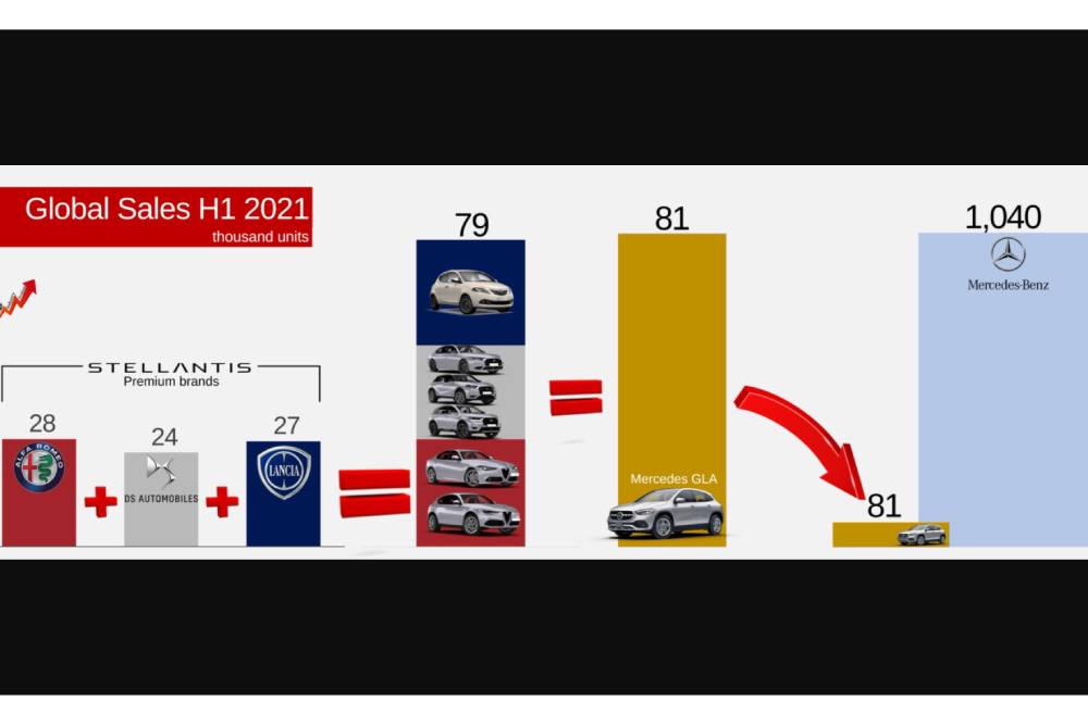 Εκεί που τα πράγματα αρχίζουν αλήθεια να χλωμιάζουν για τις premium βλέψεις της Stellantis, είναι όταν βάλεις δίπλα-δίπλα τους αριθμούς της Mercedes. Ο γερμανικός κολοσσός έκλεισε το διάστημα Ιανουαρίου-Ιουνίου στα 1,04 εκατ. αυτοκίνητα! Τις εξαμηνιαίες 79.300 μονάδες των Lancia-DS-Alfa, η Στουτγκάρδη τις κατασκευάζει μέσα σε μόλις 14 μέρες! Ακόμα πιο ψυχοφθόρα για την premium διμερή Γάλλων και Ιταλών, είναι η σύγκριση των μεγεθών με βάση τις συνολικές τους επιδόσεις. Και οι τρεις μαζί, μετά βίας ξεπέρασαν τις 79.000 μονάδες. Μόνη της η GLA, από την άλλη, κατάφερε να βρει 81.000 αγοραστές!