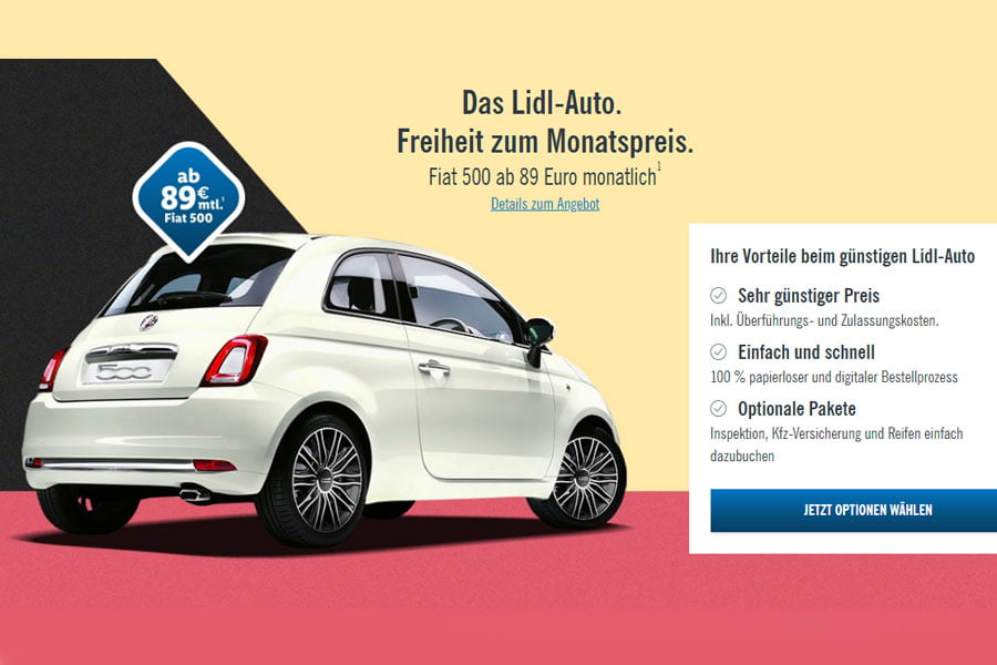 Το… Lidl car είναι το Fiat 500 1.2 Pop Star 69 hp, το οποίο προσφέρεται με 89 ευρώ μηνιαία δόση και για διάρκεια 48 μηνών με 10.000 χιλιόμετρα ετησίως. Τα χρώματα που διατίθεται το 500 είναι κόκκινο, λευκό, μαύρο και γκρι, ενώ στον εξοπλισμό του περιλαμβάνονται όλα τα απαραίτητα στοιχεία ανέσεων και ασφαλείας. Προαιρετικά προστίθεται με +68,29 ευρώ το μήνα ασφάλιση αυτοκινήτου και η συντήρηση, ενώ με +6,23 ευρώ επιπλέον το μήνα μπορεί ο κάτοχος του Lidl car 500 να αποκτήσει και χειμερινά ελαστικά. Η παραλαβή του αυτοκινήτου μπορεί να γίνει από τρεις πόλεις (Βερολίνο, Ερφούρτη και Χαλ).