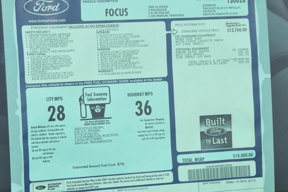 Ο πωλητής από την Μοντάνα των Η.Π.Α. αναφέρει ότι το συγκεκριμένο Focus δεν αγοράστηκε ποτέ, ενώ φέρει και την ταμπέλα με τα χαρακτηριστικά του. Το 2002 κόστιζε από 12.760 δολάρια, ενώ η τελική του τιμή διαμορφώνονταν στα 14.000 δολάρια με την προσθήκη των μεταφορικών, ABS και πλευρικών αερόσακων. Από τον εξοπλισμό του απουσιάζουν τα ηλεκτρικά παράθυρα, το air condition και το στροφόμετρο. Κάτω από το εμπρός καπό του φιλοξενείται ένας 2λιτρος 8βάλβιδος κινητήρας 110 ίππων, συνδυασμένος με 5άρι χειροκίνητο κιβώτιο. Όσο για την τιμή που προσφέρεται τώρα, κρατηθείτε: Ζητείται το ποσό των 20.000 δολαρίων (18.545 ευρώ).