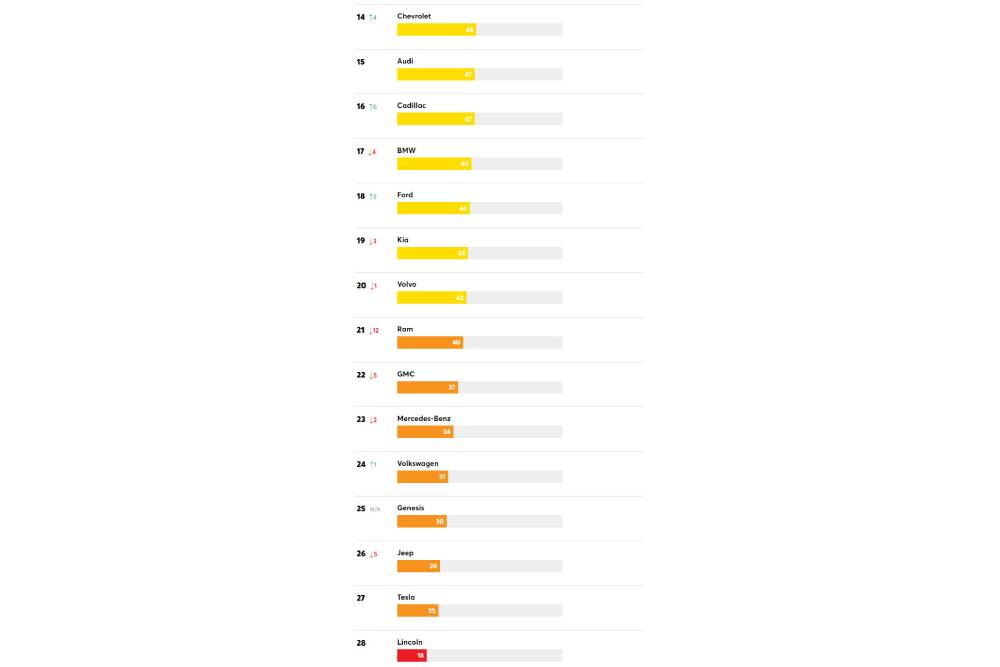 Εντύπωση προκαλεί το πόσο χαμηλά βρίσκεται η Genesis (25η με 30/100), που συνήθως πρωταγωνιστεί σε έρευνες του είδους. Αντίθετα, καμία έκπληξη για την προτελευταία θέση της Tesla (25/100) που κατάφερε να αποφύγει τον πάτο της κατάταξης καθαρά λόγω της τραγικής επίδοσης (μόλις 18/100) από τη Lincoln.