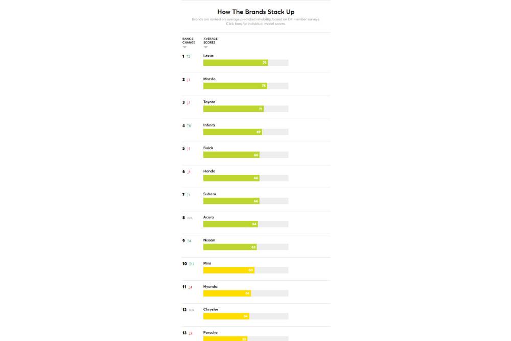 Τα αποτελέσματα προέκυψαν βάσει ερωτηματολογίου, στο οποίο απάντησαν χιλιάδες κάτοχοι αυτοκινήτων στην Αμερική. Οι ερωτήσεις περιλάμβαναν 17 διαφορετικούς τομείς (όπως κινητήρα, μετάδοση, ηλεκτρικά κλπ.) και αφορούσαν τη συμπεριφορά των οχημάτων στους προηγούμενους 12 μήνες. Η κλίμακα της βαθμολογίας εκτείνεται από τους 0 στους 100 πόντους, με τη Lexus να κατακτά πανηγυρικά την πρώτη θέση για άλλη μια φορά, με σκορ 76/100. Μια ανάσα πίσω της η Mazda (75/100) και ελάχιστα πιο μακριά η Toyota, με 71 βαθμούς. Η Infiniti ολοκλήρωσε το θριαμβευτικό «1-2-3-4» για τους Ιάπωνες, με 69 στα 100.
