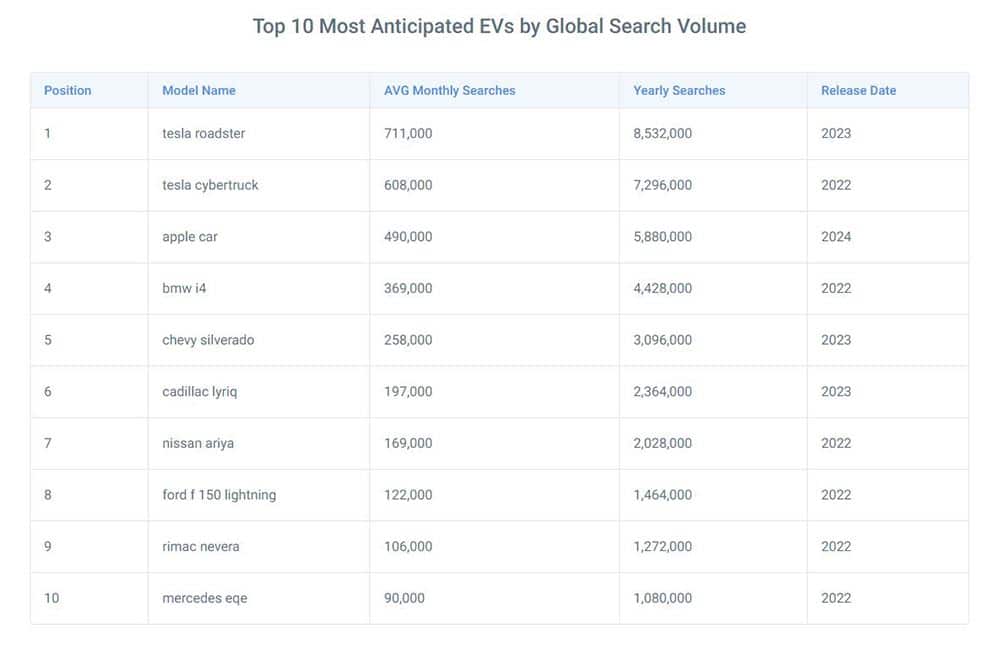 Αυτό σημαίνει πως κατά μέσο όρο το μήνα πραγματοποιήθηκαν περισσότερες από 700.000 αναζητήσεις για το συγκεκριμένο μοντέλο. Πόσο κρίμα που ο δαιμόνιος Elon Musk δεν έχει ανακοινώσει ακόμα της ημερομηνίες έναρξης της παραγωγής του Roadster. Την τιμητική του είχε όμως και το Tesla Cybertruck το οποίο ειδικά για την αγορά των Η.Π.Α., βρέθηκε στην πρώτη θέση των αναζητήσεων. Εκεί το Tesla Roadster αρκέστηκε στη 2η θέση. Όσον αφορά τον παγκόσμιο όγκο αναζητήσεων για το Cybertruck βρέθηκε δεύτερο με 7.296.000 αναζητήσεις. Ολοκληρώνοντας την πρώτη πεντάδα των ηλεκτρικών οχημάτων που αναμένει το κοινό, σύμφωνα με τη Google, είναι τα Apple Car, BMW i4 και Chevrolet Silverado EV.