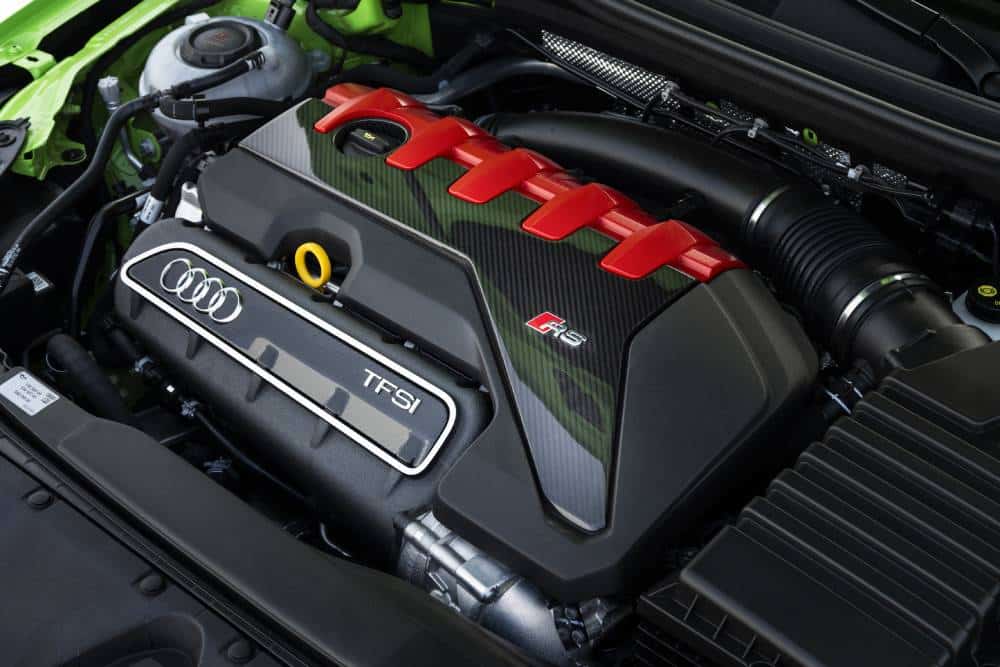 Από το 2021, το Audi RS 3 εξοπλίζεται με μια εξελιγμένη εκδοχή του 2.5 TFSI, πιο ισχυρή από κάθε προηγούμενη. Το compact σπορ μοντέλο επιταχύνει από 0–100 χλμ./ώρα σε 3,8 δλ., ενώ η τελική ταχύτητα περιορίζεται στα 250 χλμ./ώρα – ή στα 280 χλμ./ώρα προαιρετικά. Με το πακέτο RS Dynamic και τα κεραμικά φρένα, η τελική ταχύτητα φτάνει τα 290 χλμ./ώρα. Ο καθοριστικός παράγοντας πίσω από αυτές τις επιδόσεις είναι η σημαντικά αυξημένη ροπή. Ο 2.5 TFSI αποδίδει πλέον 500 Nm, διαθέσιμα από τις 2.250 έως τις 5.600 σ.α.λ., δηλαδή 20 Nm περισσότερα από το προηγούμενο μοντέλο. Η αύξηση αυτή επιτρέπει ακόμη ταχύτερη απόκριση και πιο έντονη επιτάχυνση στις μεσαίες στροφές. Η μέγιστη ισχύς των 400 ίππων είναι πλέον διαθέσιμη νωρίτερα, από τις 5.600 σ.α.λ., και παραμένει σε ένα ευρύ φάσμα έως τις 7.000 σ.α.λ. Επιπλέον, μια νέα μονάδα ελέγχου κινητήρα διασφαλίζει ταχύτερο και πιο ακριβή συντονισμό όλων των στοιχείων του συστήματος κίνησης, αναβαθμίζοντας συνολικά τα οδηγικά χαρακτηριστικά.