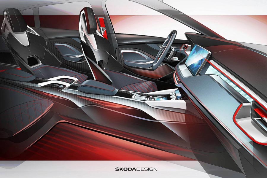Αυτή τη φορά επιστρέφει στην επικαιρότητα με το πρώτο σκίτσο από το εσωτερικό του… οράματός της αλλά και σχετικό video. Σύμφωνα με την Skoda, έχει γίνει εκτενής χρήση ανθρακονημάτων καθώς και ανακυκλώσιμου πολυεστέρα στην καμπίνα. Όπως βλέπουμε στις εικόνες αλλά και στο video πιο κάτω, στο κέντρο του ταμπλό κυριαρχεί μία οθόνη αφής, με την τσέχικη μάρκα να υπογραμμίζει πως είναι κατασκευασμένη από υψηλής ποιότητας γυαλί. Όπως φαίνεται ο πίνακας οργάνων είναι ψηφιακός, ενώ οθόνη υπάρχει και για τον χειρισμό του κλιματισμού. Από την άλλη, ο επιλογέας ταχυτήτων λάμπει δια της απουσίας του…