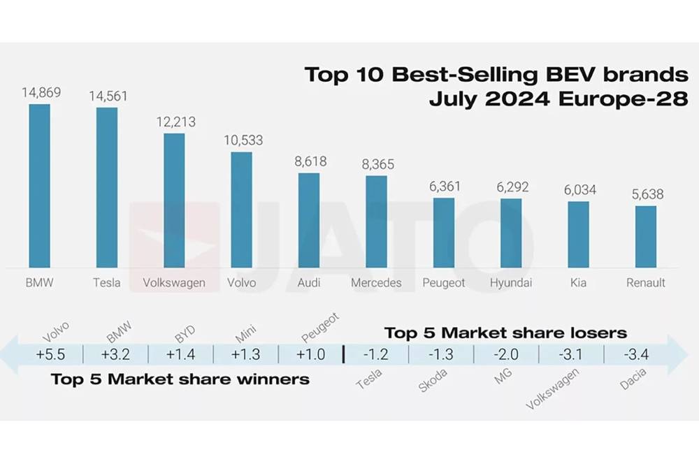 Σύμφωνα με τα στοιχεία του JATO Dynamics, για πρώτη φορά στα χρονικά οι Βαυαροί πέρασαν την Tesla σε πωλήσεις ηλεκτρικών στην Ευρώπη. Τον Ιούλιο ταξινομήθηκαν 14.869 ηλεκτρικές BMW, καταγράφοντας αύξηση 3,2% σε σύγκριση με τον περσινό Ιούλη. Η Tesla αντίθετα είδε το ποσοστό της να πέφτει κατά 1,2%, μένοντας στη δεύτερη θέση με 14.561 πωλήσεις. Ακόμα μεγαλύτερη η υποχώρηση της VW (-3,1%), που δεν ήταν αρκετή ωστόσο για να τη ρίξει από την τρίτη θέση (10.533 μονάδες). Audi και Mercedes έκλεισαν την πρώτη πεντάδα (8.618 και 8.365 ταξινομήσεις αντίστοιχα), ακολουθούμενες από τις Peugeot (6.361), Hyundai (6.292), Kia (6.034) και Renault (5.638).