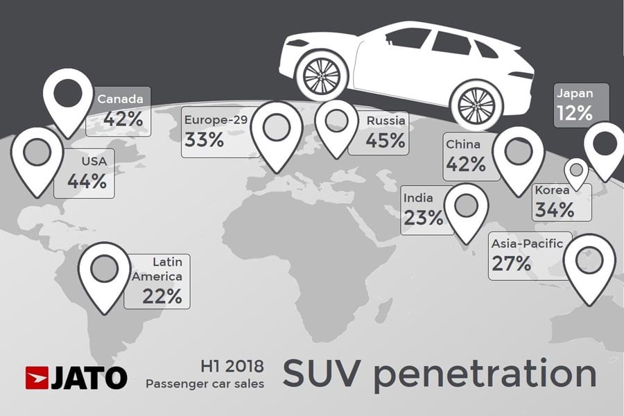 Αυτή η χώρα είναι η Ιαπωνία, στην οποία η κατηγορία των SUV έχει το μικρότερο μερίδιο αγοράς. Συγκεκριμένα, μόλις το 12% των αυτοκινήτων στην Ιαπωνία είναι SUV, τη στιγμή που το αμέσως χαμηλότερο ποσοστό είναι 22% και εντοπίζεται στην αγορά της Νοτίου Αμερικής.