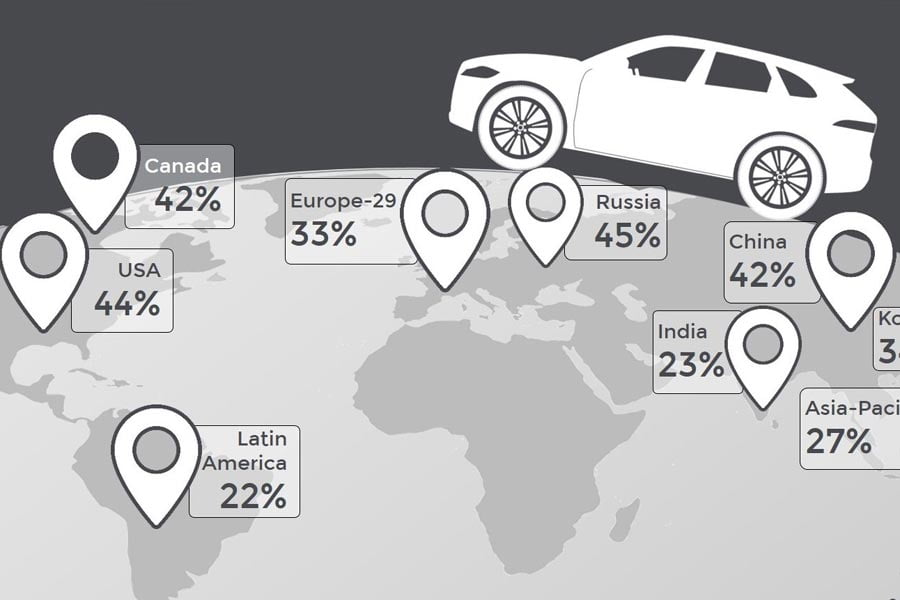 Από την άλλη τα SUV είναι δημοφιλέστερα στην Ρωσία όπου αποτελούν σχεδόν το μισά από τα νέα αυτοκίνητα που πωλούνται με μερίδιο αγοράς 45%, ενώ ακολουθούν οι Η.Π.Α. με 44% και ο Καναδάς με την Κίνα με 42%. Όσον αφορά στην ευρωπαϊκή αγορά, το μερίδιο των SUV είναι αυτή τη στιγμή στο 33% και έχει αυξητικές τάσεις.
