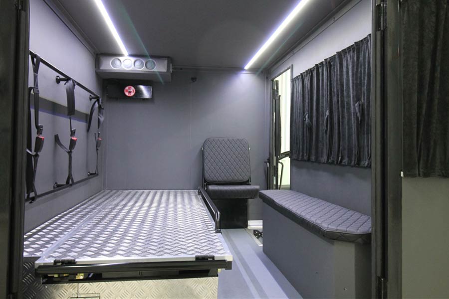 Η ειδική υπερκατασκευή είναι πλήρως ανεξάρτητη και διαχωρισμένη από την καμπίνα του οδηγού και συνοδηγού. Ο… μακάβριος εξοπλισμός για το χώρο του φέρετρου περιλαμβάνει κλιματισμό, φωτισμό, ιμάντες, κάθισμα και πάγκο.