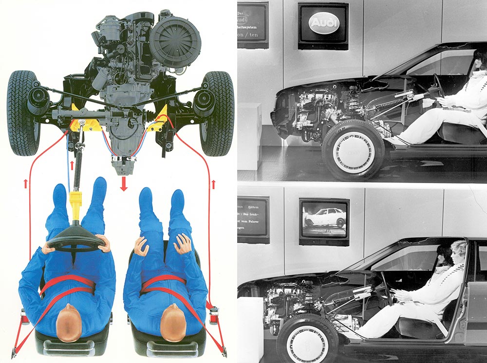 Ένα άλλο σημαντικό βήμα ακολούθησε το 1970 με τα εγκαίνια της πρώτης αίθουσας συγκρούσεων στο Ίνγκολσταντ. Μετά την κατασκευή του, το κτίριο χρησιμοποιήθηκε για πάνω από 50 χρόνια, κατά τη διάρκεια των οποίων τροποποιήθηκε και προσαρμόστηκε επανειλημμένα για να ανταποκριθεί στις νέες απαιτήσεις. Το 1972, τα ανδρείκελα δοκιμών πρόσκρουσης χρησιμοποιήθηκαν για πρώτη φορά και έγιναν ολοένα και πιο εξελιγμένα και ευέλικτα με την πάροδο των ετών. Το 1986, η Audi εισήγαγε μια κατοχυρωμένη καινοτομία: το σύστημα παθητικής ασφαλείας procon-ten. Σε μια μετωπική σύγκρουση, το τιμόνι απομακρύνεται από τον οδηγό και οι μπροστινές ζώνες σφίγγονται με τη μετακίνηση του κινητήρα προς το χώρο επιβατών μέσω χαλύβδινων συρμάτων και τροχαλιών. Το σύστημα μείωσε σημαντικά τον κίνδυνο τραυματισμών στο κεφάλι για τον οδηγό σε περίπτωση ατυχήματος.