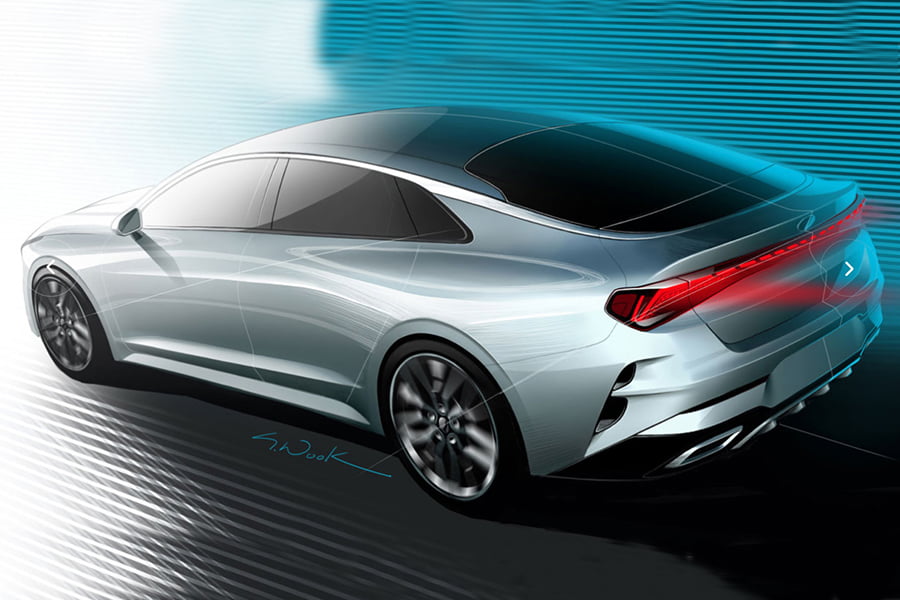 Από τις πρώτες εικόνες που έχουμε δει μέχρι στιγμής, το νέο Optima (Κ5 για την αγορά της Νότιας Κορέας) εντυπωσιάζει με την δυναμική του εμφάνιση, που ξεχωρίζουν οι δυναμικές γραμμές του αμαξώματος, που «παντρεύονται» περίτεχνα με τις πληθωρικές καμπύλες του. Σχεδιαστική τεχνοτροπία, η οποία επιβεβαιώνεται και από την τελευταία εικόνα του αμαξώματος, με τις έντονες γραμμές να ξεκινούν από το εμπρόσθιο τμήμα του Optima και να καταλήγουν στα πίσω τονισμένα φτερά. Στο οπίσθιο τμήμα του Kia Optima, στο κατώτερο σημείο του προφυλακτήρα υπάρχει ένας αεροδυναμικός διαχύτης, ενώ το παρόν δίνουν και δύο απολήξεις της εξάτμισης. Όμως και από τα σκίτσα του εμπρόσθιου τμήματος, όπου και σας παραθέτουμε, η Kia έχει βάλει στόχο να προσφέρει στο αγοραστικό κοινό της, ένα οικογενειακό μοντέλο μεν, το οποίο όμως θα βρίθει δυναμισμού δε.
