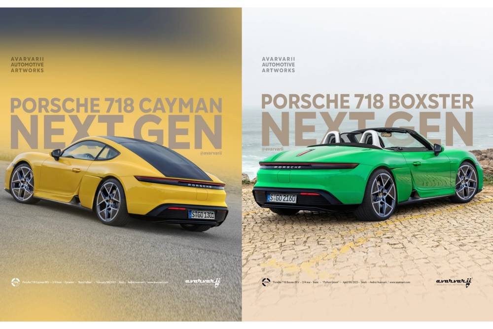 Η 4η εκδοχή του κεντρομήχανου κουπέ από το Τσουφενχάουζεν (5η για την Boxster) θα αντλεί έμπνευση από το πρωτότυπο Mission R, όπως φανερώνουν τα renderings του Avarvarii. Οι μεγάλες και αιχμηρές εισαγωγές (ηλεκτρονικά ανοιγοκλειόμενες) του προφυλακτήρα συνδυάζονται με πολύ λεπτά φωτιστικά σώματα, αλλάζοντας άρδην κατεύθυνση σε σχέση με την οβάλ διαρρύθμιση των φαναριών στις 718. Πίσω η εικόνα έρχεται πιο κοντά σε εκείνη της Taycan, με τα μακρόστενα φωτιστικά σώματα, ενώ το βλέμμα πέφτει κατευθείαν πάνω στην απουσία των διπλών εξατμίσεων που θαυμάζουμε στη σημερινή Cayman.