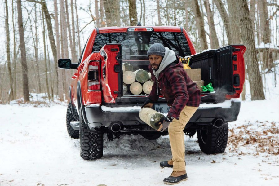 Η RAM φροντίζει να μας το υπενθυμίσει, παρουσιάζοντας την πρώτη πόρτα καρότσας – «Transformer» στην κατηγορία! Το σύστημα RAM Multifunction Tailgate προσφέρει 4 διαφορετικές επιλογές ανοίγματος: την κλασική με ολόκληρη την πόρτα κάτω, κάθετα μόνο το δεξί μέρος, το ίδιο για το αριστερό, αλλά και για τα δυο κομμάτια μαζί. Η αναλογία στην επιφάνεια του ανοίγματος της πόρτας φτάνει το 60-40, με τα δυο τμήματα να ανοίγουν σχεδόν σε ορθή γωνία (88 μοίρες). Σύμφωνα με τους Αμερικανούς, η πατέντα αυτή βελτιώνει τα μάλα την φορτοεκφόρτωση ογκωδών αντικειμένων, καθώς σου επιτρέπει να πλησιάσεις πιο κοντά στην καρότσα και σε απαλλάσσει από το εμπόδιο της ριγμένης πόρτας. Το ίδιο ισχύει και για φορτία μικρότερου μεγέθους, αλλά μεγάλου μήκους, για τα οποία πλέον δεν απαιτείται να ανοίξεις ολόκληρη την πόρτα κερδίζοντας έτσι χρόνο και πόντους πρακτικότητας.