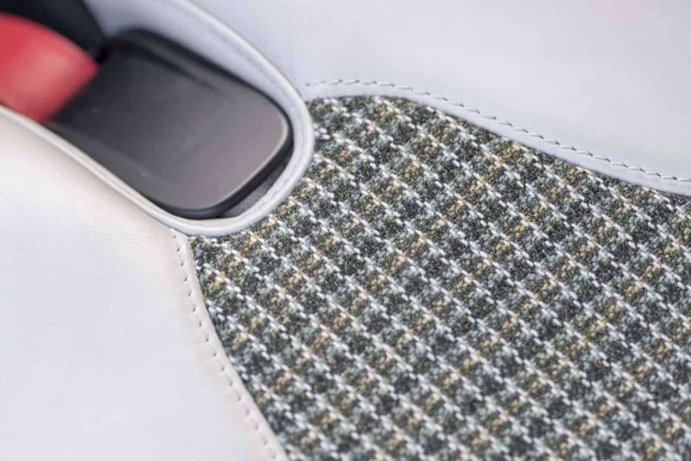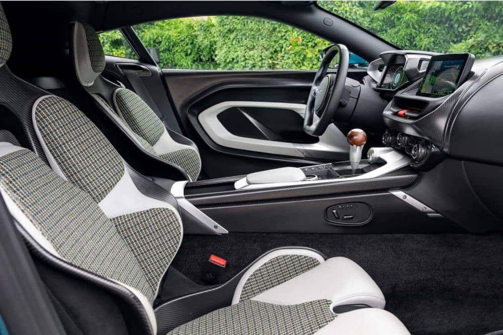 To εσωτερικό είναι κατά βάση ίδιο με της V12 Vantage, αλλά διαφοροποιούμενο από εκείνο στην κεντρική κονσόλα και το σχεδιασμό των αεραγωγών. Φυσικά, το μάτι μπορεί και να μη δει καν αυτά τα δύο, καθότι μαγεμένα απασχολημένο από τον αισθαντικό επιλογέα του 6τάχυτου χειροκίνητου κιβωτίου! Η λαβή αποτελείται από γυαλισμένο ξύλο και το υπόλοιπο σκέλος από βουρτσισμένο αλουμίνιο, ενώ μπροστά τους δεσπόζει το start-button του κινητήρα. Οι λεπτομέρειες της καμπίνας περιλαμβάνουν επίσης ανθρακονημάτινα πάνελ εσωτερικά των θυρών, αλλά και μάλλινες επενδύσεις («Woollen Tweed» τις λέει η Aston Martin) στα μπάκετ καθίσματα που εμπνέονται από τις αντίστοιχες της DBR1, νικήτριας στο Le Mans του 1959. Από το ίδιο αυτοκίνητο εμπνέεται και ο πρωταγωνιστής, τουτέστιν ο ξύλινος επιλογέας για το 6άρι μηχανικό κιβώτιο.