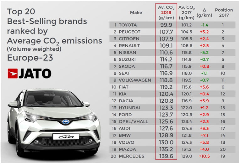 Μεταξύ των μαρκών αυτοκινήτου, η Toyota παρέμεινε στην κορυφή με το μικρότερο μέσο όρο εκπομπών CO2 ανάμεσα στις 25 μάρκες με τις περισσότερες πωλήσεις. Συγκεκριμένα, η Toyota σημείωσε μέσο όρο κάτω των 100 γρ./χλμ. (99,9%) για πρώτη φορά από τότε που ξεκίνησε η παρακολούθηση των μέσων όρων εκπομπών CO2. Κάτι στο οποίο συνέβαλαν οι ταξινομήσεις των υβριδικών Toyota, οι οποίες έφτασαν το 60%. Η Toyota ήταν επίσης μία από τις πέντε μάρκες που σημείωσαν βελτίωση σε σύγκριση με το 2017, με τις εκπομπές να μειώνονται κατά 1,4 γρ./χλμ. Αυτό οφείλεται κυρίως στις καλές εμπορικές επιδόσεις του Toyota C-HR και του συνδυασμού του τύπου καυσίμου του.