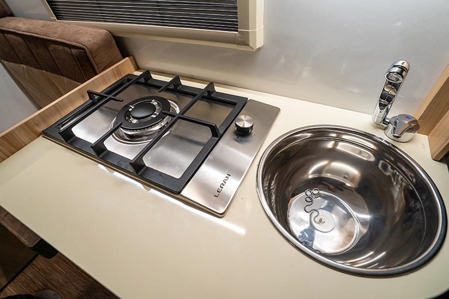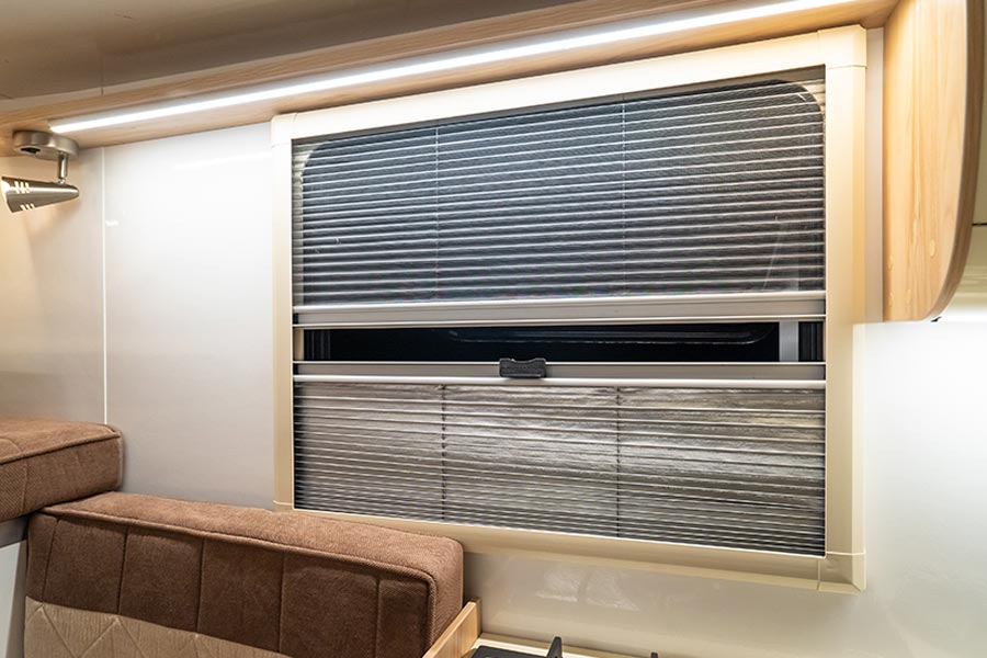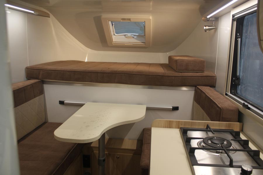 Η καμπίνα παρέχει όλες τις απαραίτητες ανέσεις σε δύο φιλοξενούμενους και εφόσον είναι κατάλληλα εφοδιασμένοι δεν θα τους λείψει κάτι στην εξοχή. Το φιλόξενο εσωτερικό εξοπλίζεται με διπλό καναπέ διαστάσεων 115×55 εκ., μονό καναπέ 65×55 εκ. και με διπλό κρεβάτι 1.580×1.980 χλστ. Στην καμπίνα υπάρχουν ακόμη πτυσσόμενο τραπέζι, LED φωτισμός, ντουλάπα, νεροχύτης, κουζίνα υγραερίου, ψυγείο, πρίζες, τουαλέτα, ντους, δεξαμενή νερού 70 λτ. κ.α.