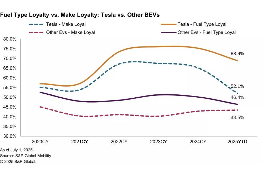 Συγκεκριμένα στην Tesla τώρα, αρχικά το 58,1% των αγοραστών επενδύει χρήματα στην εκ νέου απόκτηση μοντέλου από τη γκάμα του Αμερικανού κατασκευαστή. Επίδοση που επί εδαφών Η.Π.Α. κατατάσσει την Tesla πίσω από τη Ford (59,1%), αλλά μπροστά από τις Chevrolet (58%), Toyota (57,3%), Honda (54,9%) και Mercedes (54,2%). Συνολικά στην πίστη των κατόχων για ηλεκτρικό, το 68,9% όσων φεύγουν από την Tesla αγοράζουν ξανά ηλεκτρικό. Το 2023 ωστόσο, το ποσοστό ξεπερνούσε το 75%. Το εναπομείναν 31,1% κάνει comeback στην αμόλυβδη (28,2%) και το ντίζελ (2,9%). Ειδικά για το πετρέλαιο το ποσοστό ναι μεν είναι μικρό, αλλά οι αναλυτές τονίζουν πως πρόκειται για ασυνήθιστη κίνηση από κατόχους EV, να στραφούν στο ντίζελ δηλαδή αντί για τη βενζίνη ή την υβριδική τεχνολογία.