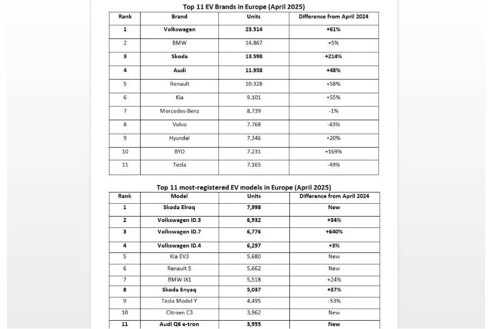 Συνολικά, η VW κατάκτησε την 1η θέση μεταξύ όλων των κατασκευαστών καταγράφοντας 23.514 πωλήσεις ηλεκτρικών οχημάτων τον Απρίλιο, σημειώνοντας αύξηση +61% σε σύγκριση με τον ίδιο μήνα πέρυσι. Η Skoda, με 13.598 πωλήσεις και άνοδο +214%, βρέθηκε στην 3η θέση, ενώ η Audi κατέλαβε την 4η θέση, με 11.958 πωλήσεις και αύξηση +48%. Τα αποτελέσματα αυτά εδραιώνουν τον Όμιλο Volkswagen ως την κορυφαία δύναμη στην ευρωπαϊκή αγορά ηλεκτρικών οχημάτων.