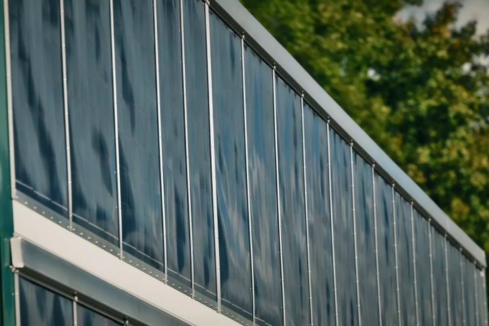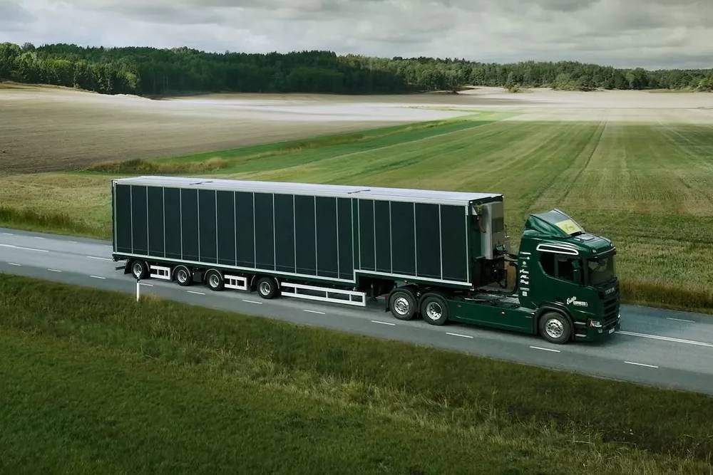 Αν παρατηρήσουμε προσεκτικά, θα διαπιστώσουμε πως το περίβλημα αποτελείται από κάθετα τοποθετημένα πάνελ. Ηλιακά πάνελ, για την ακρίβεια. Οι Σουηδοί έχουν ντύσει ολόκληρη την καρότσα με φωτοβολταϊκά, ικανά να παράγουν μέχρι 8.000 kWh ενέργειας ετησίως – στη σκανδιναβική χώρα. Στην Ελλάδα ή κάποια άλλη ηλιόλουστη περιοχή της Μεσογείου, η αποδοτικότητα εκτοξεύεται. Τα πάνελ εκτείνονται σε όλη τη 18μετρη επιφάνεια της καρότσας, καταλαμβάνοντας συνολικά 100 τετραγωνικά μέτρα. Μια μπαταρία 200 kWh στο τρέιλερ συνεργάζεται με μια ακόμα 100 kWh στον τράκτορα, αντλώντας αμφότερες ενέργεια από τα φωτοβολταϊκά.