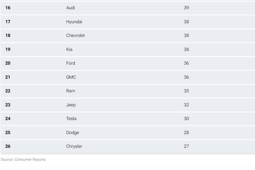 Στην αντίπερα όχθη τώρα, Ram, Jeep, Tesla, Dodge και Chrysler έδωσαν «μάχη» για το ποια θα βγει τελευταία. Η Chrysler δύσκολα χάνει τέτοιες αναμετρήσεις βέβαια, οπότε το απογοητευτικό 27/100 και ο πάτος της κατάταξης ήταν κάτι παραπάνω από αναμενόμενο. Το ότι η Tesla είναι χαμηλά, επίσης. Όπως βλέπουμε, 4/5 τελευταίες ανήκουν στο δυναμικό της Stellantis. Συνεπώς, δεν έχει τόσο άδικο ο πολυεθνικός κολοσσός που ενδέχεται να «κόψει» μάρκες μετά το πέρας της δεκαετίας, αν δεν διορθώσουν τις πορείες τους.