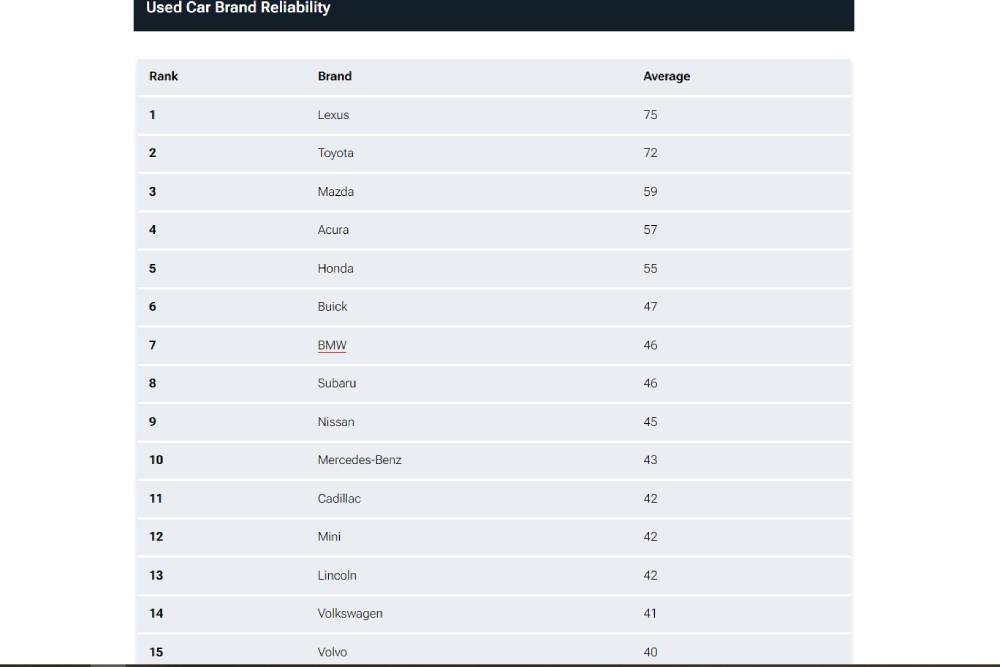 Το CR εξέτασε τα παράπονα και τα επισκεπτήρια στα συνεργεία κατόχων μεταχειρισμένων, χρονολογίας 2014-2019. Ένα από τα πιο εμπορικά τμήματα της αγοράς μεταχειρισμένου στην Αμερική, όπου διαπρέπει το «δεύτερο χέρι» στα 5-10 χρόνια. Τι πιο σύνηθες, λοιπόν, να βλέπουμε τους Ιάπωνες πρακτικά να κάνουν κατάληψη στο top 10, παίρνοντας τις 7 από τις 10 πρώτες θέσεις! Η βαθμολογία προέκυψε με σκορ καλύτερης παρουσίας και όχι με προβλήματα ανά 100 αυτοκίνητα, όπως συμβαίνει στα καινούργια αυτοκίνητα. Άριστα ήταν το 100, το οποίο κανείς δεν κατάφερε να πλησιάσει. Για την ακρίβεια μόλις 5 μάρκες κατάφεραν να περάσουν τη βάση (50), ενώ στο αντίθετο άκρο 3 εταιρίες με το ζόρι βρέθηκαν στην περιοχή του 30.