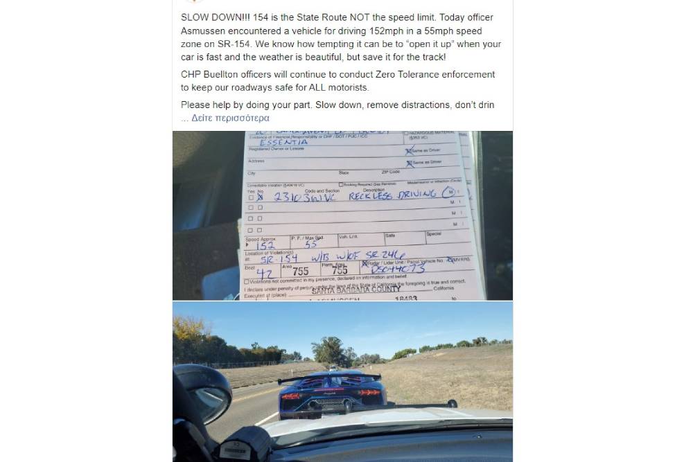 Ο Zhan John Akopyan συνελήφθη από τις συσκευές της τροχαίας αυτοκινητοδρόμων στην Καλιφόρνια, ενόσω κινείτο με 244 χλμ./ώρα (152 μίλια/ώρα) στον κόμβο 154. Δρόμος όπου κανονικά, το μέγιστο επιτρεπόμενο όριο είναι τα 88 χλμ./ώρα (55 μίλια/ώρα). Οι αστυνομικοί δεν δυσκολεύτηκαν να εντοπίσουν αργότερα τη «φτερωτή» Aventador, βεβαιώνοντας στον 50χρονο ιδιοκτήτη της πρόστιμα για υπέρβαση του ορίου ταχύτητας και επικίνδυνη οδήγηση. Ο Akopyan ωστόσο δήλωσε αθώος στην ακροαματική διαδικασία, οπότε θα πρέπει να περιμένει το αποτέλεσμα της δίκης για να δει το ύψος της ποινής (όχι ότι θα αλλάξει κάτι, δηλαδή).
