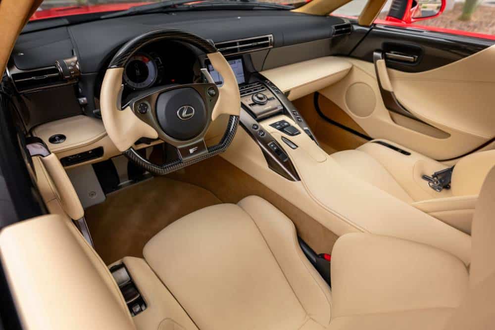 Αναμενόμενα, οι τιμές που πιάνει ένα τέτοιο αυτοκίνητο όταν βγαίνει στην αγορά των μεταχειρισμένων ή των δημοπρασιών είναι δυσθεώρητες. Ιδίως όταν πρόκειται για δείγμα με ελάχιστα ή πολύ λίγα χιλιόμετρα. Το φλογερά κατακόκκινο που βλέπουμε, είναι το υπ’ αριθμόν 107. Κατασκευάστηκε το 2012, κάτι που το τοποθετεί στην τελευταία παρτίδα LFA (διαβάστε τί σημαίνει, όπως και τα υπόλοιπα ονόματα της Lexus), και αγοράστηκε ολοκαίνουργιο από τον πρώτο -και μέχρι σήμερα, μοναδικό- ιδιοκτήτη. Εκείνος, ως είθισται στις περισσότερες τέτοιες περιπτώσεις, το κλείδωσε στο γκαράζ και περίμενε καρτερικά να εκτιναχθεί η αξία μεταπώλησης. Κάπως έτσι εξηγούνται πολύ εύκολα τα μόλις 268 μίλια (431 χλμ.) στο οδόμετρο, με τα πάντα να διατηρούνται σε άψογη κατάσταση.