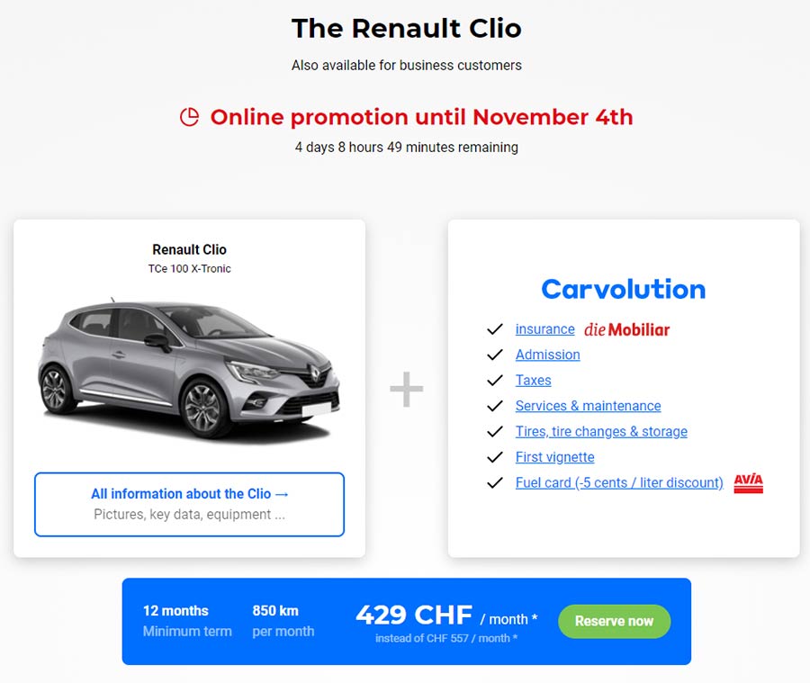 Ο ελάχιστος χρόνος συμβολαίου είναι 12 μήνες με έως 850 χιλιόμετρα το μήνα (10.000 χλμ. το χρόνο) και το μηνιαίο μίσθωμα είναι 429 ελβετικά φράγκα (402 ευρώ), όταν με άλλη εταιρεία leasing το ποσό φτάνει τα 865 ελβετικά φράγκα (810 ευρώ). Να σημειωθεί ότι η προκαταβολή είναι μηδενική, ενώ η τιμή του αυτοκινήτου στην Ελβετία είναι 20.500 ελβετικά φράγκα (19.194 ευρώ σημερινή ισοτιμία). Μάλιστα η εταιρεία Carvolution που αναλαμβάνει τη μίσθωση, μπορεί να στείλει το αυτοκίνητο στο σπίτι του πελάτη.