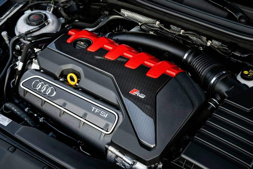 Ο 2.5άρης πεντακύλινδρος τούρμπο TFSI συνεχίζει ακάθεκτος, με απόδοση 400 άλογα στις 5.600-7.000 σ.α.λ. και 500 Nm στις 2.250-6.000 σ.α.λ. Το 7άρι αυτόματο διπλού συμπλέκτη S tronic και το σύστημα τετρακίνησης quattro αναλαμβάνουν τη μετάδοση, εκτοξεύοντας το RS 3 στα πρώτα 100 χλμ./ώρα εντός 3,8 δλ. και μέχρι τα 290 χλμ./ώρα. «Βολίδα» στις στροφές και στην ευθεία το μικρότερο RS.