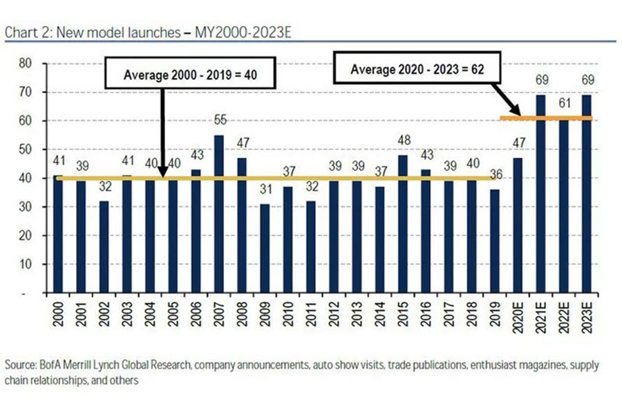 Αλλά εν αντιθέσει με τις πεποιθήσεις των ανθρώπων της αγοράς, οι κατασκευάστριες εταιρείες συνεχίζουν να επενδύουν σε SUV μοντέλα, όπου σύμφωνα με τα τελευταία δεδομένα, την τριετία 2020 – 2023 αναμένεται να λανσάρουν 246 νέα ή σημαντικά ανανεωμένα SUV μοντέλα, κάτι που σημαίνει πως κατά μέσο όρο θα έχουμε 62 νέα SUV κάθε χρονιά.