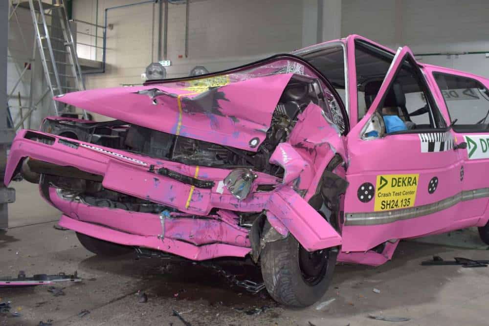 Η γερμανική DEKRA πήρε ένα Golf II (κατασκευάστηκε μεταξύ 1983 έως 1992) του ’89 και το έθεσε στη δοκιμασία της μετωπικής σύγκρουσης στα 64 χλμ./ώρα, με το 40% της μετωπικής του επιφάνειας πάνω σε μια μεταλλική μπαριέρα που παραμορφώνεται. Ένα τεστ πρόσκρουσης που χρησιμοποιούσε ο Euro NCAP μέχρι το 2020 και αντιστοιχεί σε μια μετωπική σύγκρουση μεταξύ δύο πανομοιότυπων οχημάτων που κινούνται με ταχύτητα περίπου 50 έως 55 χλμ./ώρα. Αναμενόμενα, τα μετρητικά όργανα χτύπησαν «κόκκινο» παντού. Φαίνεται και με την πρώτη ματιά, εξάλλου, που το αμάξωμα και το σασί του 36χρονου χάτσμπακ έγιναν «φυσαρμόνικα». Σε αυτά προσθέστε την απουσία αερόσακων, η οποία μεταφράζεται σε υψηλότατο κίνδυνο θανατηφόρων τραυματισμών για οδηγό-συνοδηγό, ή πρόκληση εγκεφαλικών βλαβών. Τα κεφάλια και των δυο ανδρείκελων χτύπησαν σε τιμόνι-ταμπλό αντίστοιχα, ενώ μεγάλα προβλήματα αντιμετώπισαν και τα πόδια. Τόσο η κολώνα του τιμονιού όσο και το ταμπλό μετατοπίσθηκαν έντονα, μεταφέροντας υψηλά φορτία στα πόδια των crash test dummies.
