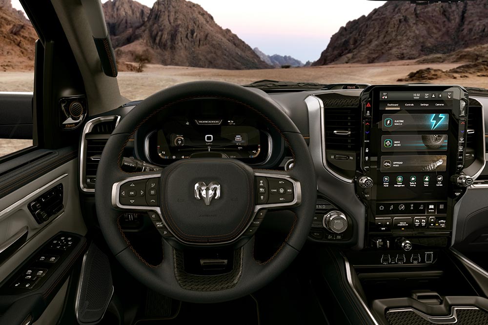 Το Ram 1500 REV τροφοδοτείται με δύο ηλεκτροκινητήρες, έναν σε κάθε άξονα. Μαζί αποδίδουν 654 ίππους και ροπή που αγγίζει τα 1.140 Nm, επιτρέποντας στο αμιγώς ηλεκτρικό pickup (και σίγουρα αρκετά βαρύ) να επιταχύνει στο 0-100 σε μόλις 4,4 δλ. Επίσης, το ωφέλιμο φορτίο φτάνει τους 1,2 τόνους και η ικανότητα ρυμούλκησης είναι 6,3 τόνοι. Το Ram 1500 REV διαθέτει ανάρτηση πολλαπλών συνδέσμων στον πίσω άξονα (αντί άκαμπτου άξονα με φύλλα σούστας) και αμορτισέρ προσαρμοζόμενης απόσβεσης. Η ρυθμιζόμενη αερανάρτηση περιλαμβάνει πέντε διαφορετικές λειτουργίες, ενώ οι ζάντες των 22 ιντσών (!) φορούν ελαστικά διαστάσεων 275/50.