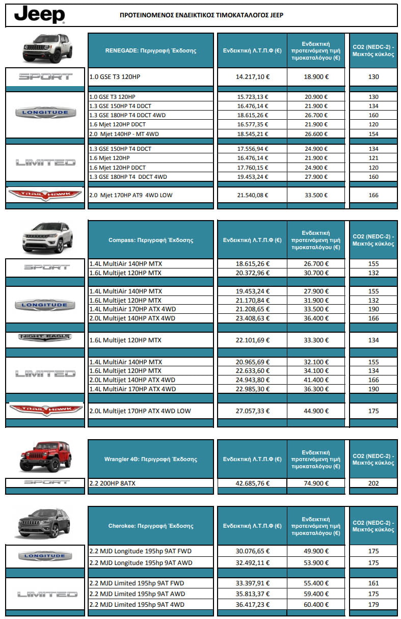 Ακολουθεί ο νέος τιμοκατάλογος των Jeep Renegade, Compass, Cherokee, καθώς και του εμβληματικού Jeep Wrangler, τα οποία είναι διαθέσιμα στο Δίκτυο Εξουσιοδοτημένων Διανομέων Jeep της FCA Greece. Ιδιαίτερη μέριμνα δόθηκε ώστε στο νέο τιμοκατάλογο της Jeep οι λιανικές τιμές προ φόρων να προσφέρουν στους πελάτες της μάρκας το μέγιστο όφελος σε σχέση με το ισχύον φορολογικό καθεστώς.