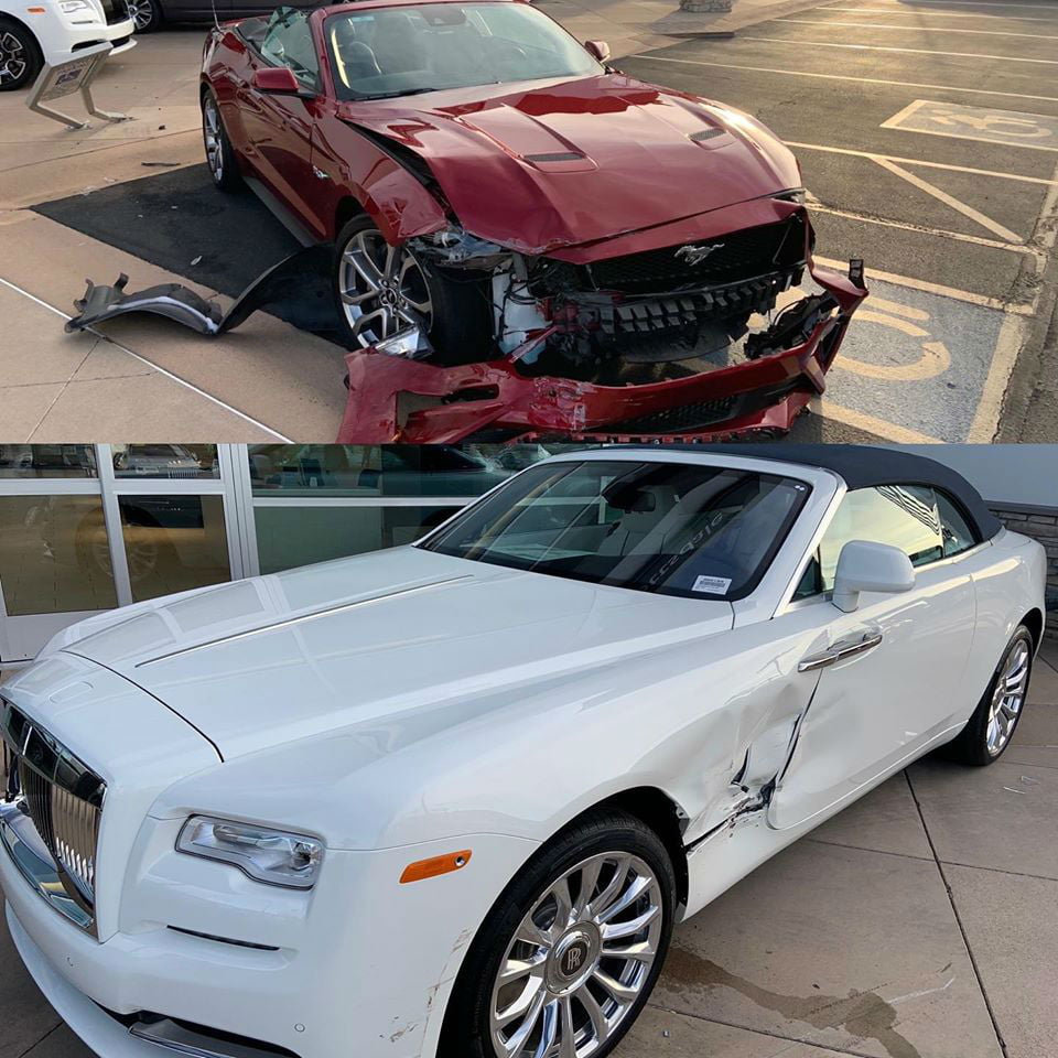 Το sportscar της Ford επιτάχυνε ανεξέλεγκτο, καταλήγοντας πάνω σε μια Rolls-Royce Dawn Convertible! Η ζημιά είναι πολύ μεγαλύτερη στη Mustang, όπου το εμπρός μέρος «κρέμασε» ολόκληρο, όμως είμαστε σίγουροι πως η φαναρτζοδουλειά της Rolls ενδέχεται να κοστίζει περισσότερο από όσο ολόκληρη Mustang, άθικτη κιόλας! Ίσως ο φίλτατος θα έπρεπε να προσανατολιστεί περισσότερο στα Toyota, που έχουν τεχνολογία αντιμετώπισης τέτοιων καταστάσεων, και να αφήσει τα muscle cars κατά μέρος…