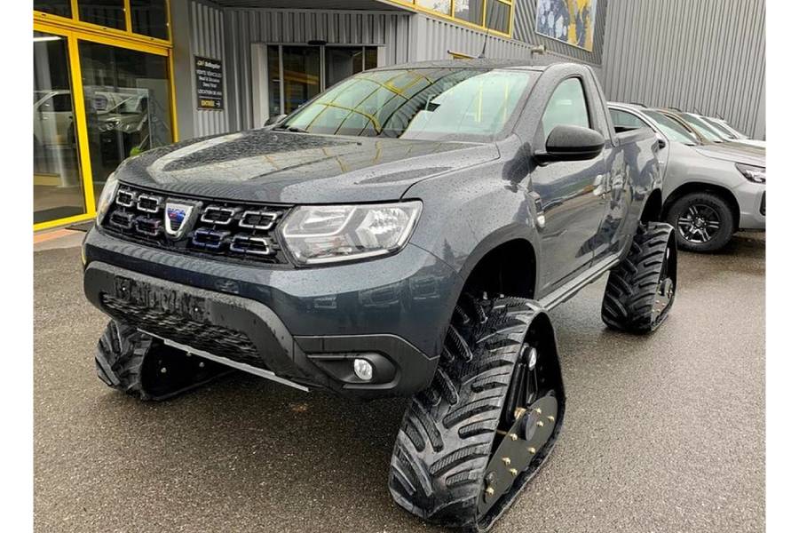 Η γαλλική εταιρία Garage 4×4 Balleydier αναλαμβάνει να κάνει το Duster Pick Up κυριολεκτικά ασταμάτητο, αντικαθιστώντας τους τροχούς με ερπύστριες! Βέβαια το έργο του 1.5οοάρη DCi γίνεται αρκετά πιο δύσκολο, καθώς οι 115 ίπποι και τα 260 Nm εκτός του ότι καλούνται να αντιμετωπίσουν την ασύγκριτα μεγαλύτερη τριβή των εν λόγω εξαρτημάτων, έχουν να κινήσουν και σχεδόν 450 κιλά παραπάνω. Κάθε ερπύστρια ζυγίζει 111 κιλά, ανεβάζοντας το συνολικό «μπιλιετάκι» της ζυγαριάς στα 444 κιλά! Η τεράστια αύξηση της μη αυτοφερόμενης μάζας, αλλά και του ολικού βάρους, περιορίζουν την τελική ταχύτητα στα 60 χλμ./ώρα και επιβάλλουν ενισχύσεις στην ανάρτηση, τις πλήμνες, το σύστημα διεύθυνσης και τα διαφορικά, ώστε να μην υπάρχουν προβλήματα με τη λειτουργία της τετρακίνησης ή του 6τάχυτου χειροκίνητου κιβωτίου.