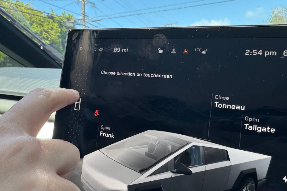 Στο Cybertruck, και εσχάτως στα Model 3/Υ, ο έλεγχος του κιβωτίου έχει περάσει (και αυτός) στην οθόνη. Ο οδηγός σύρει το δάχτυλό του στο μόνιτορ πάνω-κάτω, προκειμένου να αλλάζει από Park σε Drive κι ούτω καθεξής. Για λόγους ασφαλείας η Tesla τοποθετεί και κουμπιά, αλλά στην πλαφονιέρα!
