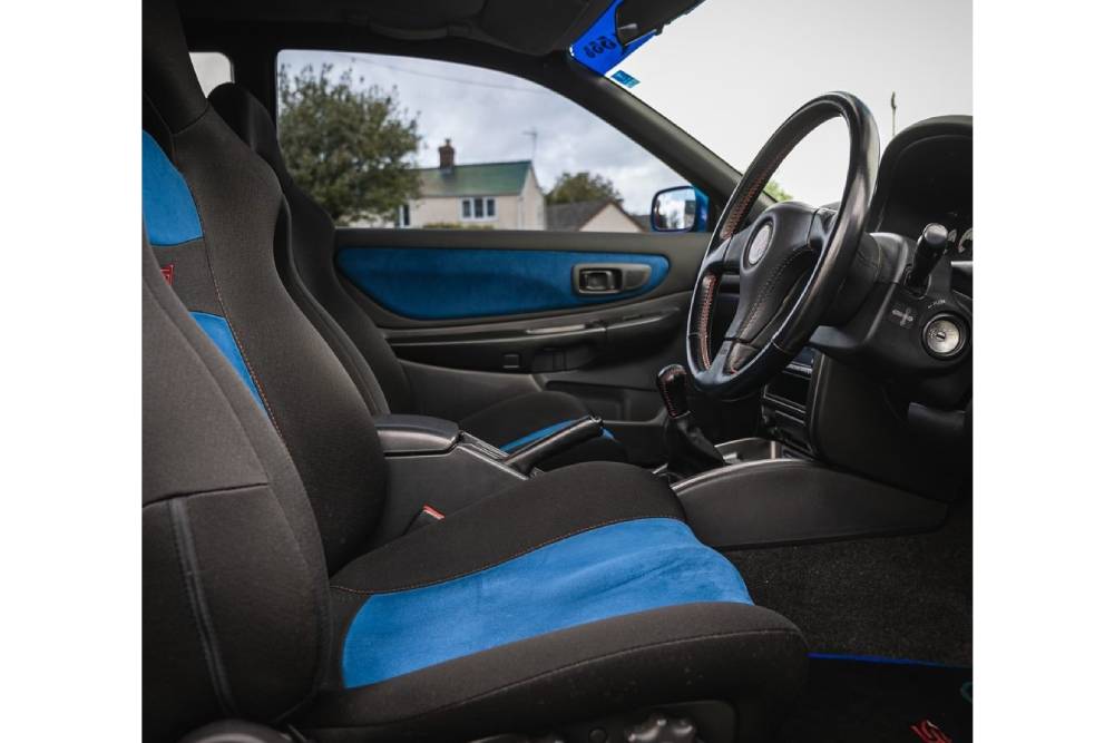 Στο εσωτερικό ξεχώριζαν τα μπάκετ καθίσματα της Recaro, το τριάκτινο δερμάτινο τιμόνι, οι κόκκινες ραφές και το σήμα της Subaru Tecnica International μπροστά από τον οδηγό, στο κέντρο του «πηδαλίου».