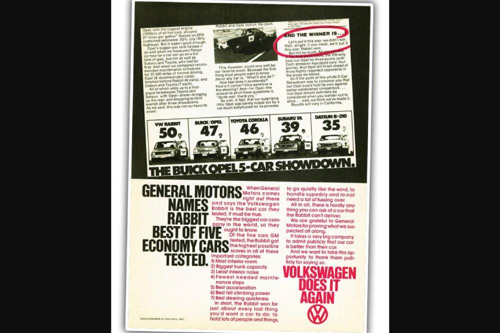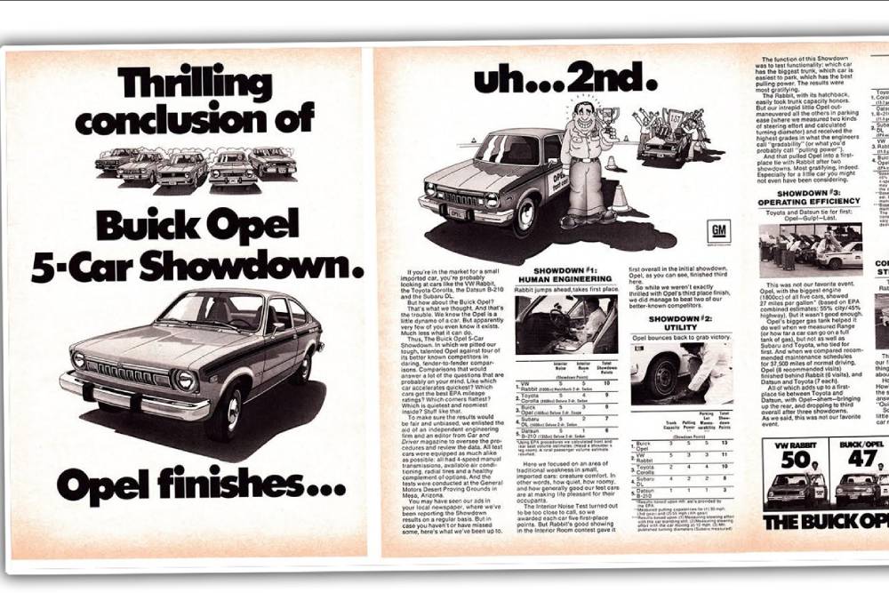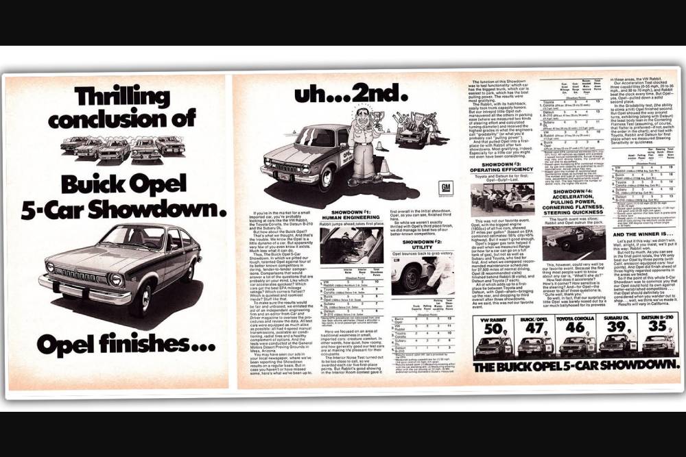 Στο συγκριτικό/διαφημιστικό που η ίδια η GM πλήρωσε για την προώθηση του Buick Opel, νικητής αναδείχτηκε το VW Rabbit! Το αμερικανογερμανικό χάτσμπακ παραλίγο να μην τερματίσει ούτε δεύτερο, καθώς πέρασε το Toyota Corolla για έναν μόλις πόντο. Η VW εννοείται έκανε «πάρτι» με το αυτογκόλ των Αμερικανών, απολαμβάνοντας δωρεάν διαφήμιση από έναν βασικό ανταγωνιστή της. Ουδείς εξήγησε ποτέ το λόγο που η Buick πανηγύρισε τη δεύτερη θέση, σε συγκριτικό που η ίδια οργάνωσε, ή το γιατί οι υψηλά ιστάμενοι της GM έδωσαν το «OK» για αυτό το φιάσκο.