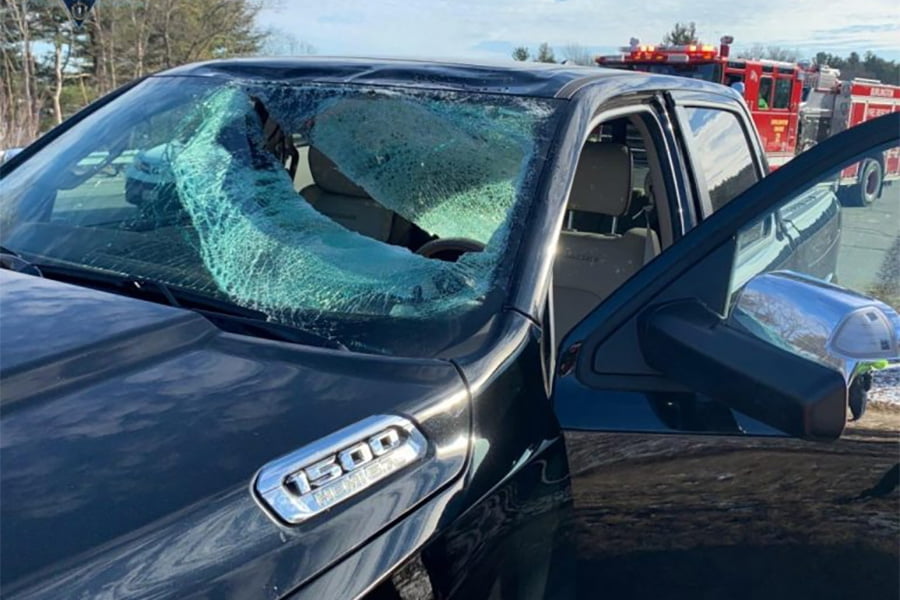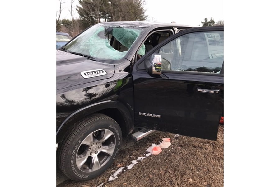 Ο οδηγός ενός Ram 1500 του 2019, νοσηλεύεται στο Γενικό Νοσοκομείο της Μασαχουσέτης με σοβαρά τραύματα στο πρόσωπο. Το μεγάλο κομμάτι που έπεσε πάνω στο παρμπρίζ του μεγάλου pick-up, εκτόξευσαν τα γυαλιά στο πρόσωπο του οδηγού. Στο Ram εκτός από τον οδηγό, βρισκόταν η 38 ετών σύζυγος, ο 3 ετών γιος του και η μόλις 18 μηνών κόρη τους. Αυτοί μεταφέρθηκαν ευτυχώς με ελαφρούς τραυματισμούς, άμεσα στο νοσοκομείο. Ο πάγος έπεσε από την οροφή ενός φορτηγού που ταξίδευε μπροστά από το Ram 1500 και το οποίο συνέχισε την πορεία του κανονικά. Ο οδηγός δεν είχε καταλάβει τίποτε, μέχρι που ένα περιπολικό τον σταμάτησε λίγα λεπτά μετά το ατύχημα.