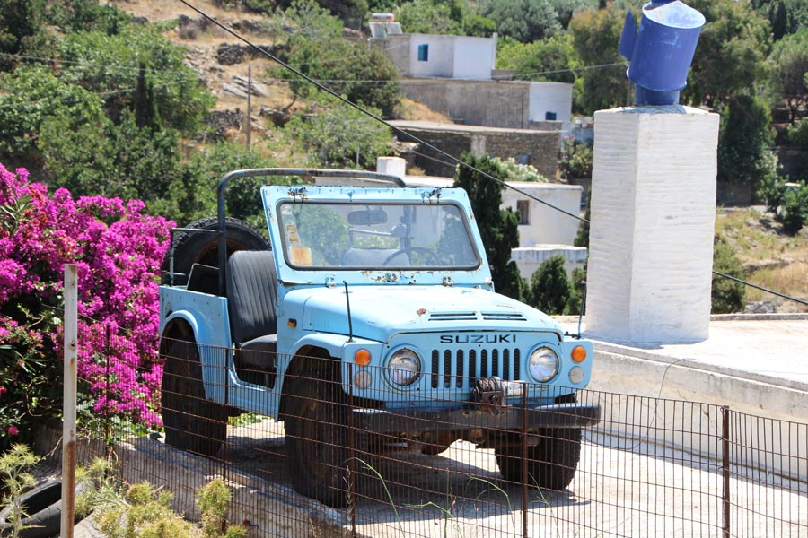 Αυτό που μας τράβηξε περισσότερο το ενδιαφέρον, είναι το εικονιζόμενο πρώτης γενιάς Suzuki Jimny 55 ή SJ10. Όταν βρισκόταν εν ζωή θα είχε σκαρφαλώσει σε όλους τους χωματόδρομους του νησιού και θα ήταν αρκετά μάχιμο, αν κρίνουμε από τον εργάτη μπροστά και τον κοτσαδόρο πίσω.