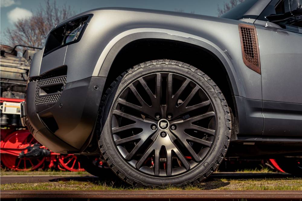 Πέρα από τα διαβρωμένα στοιχεία το συγκεκριμένο Defender διαθέτει 22άρες ζάντες (και ρεζέρβα), ενώ στο εσωτερικό τοποθετούνται custom δερμάτινες επενδύσεις και ενθέσεις αλουμινίου. Επιπλέον, οι Βέλγοι προσφέρουν στρώσεις αλουμινίου, τιτανίου, χαλκού, ακόμα και χρυσού στα επίμαχα πάνελ, ώστε να διατηρήσει την εμφάνισή του αναλλοίωτη για 20 χρόνια.