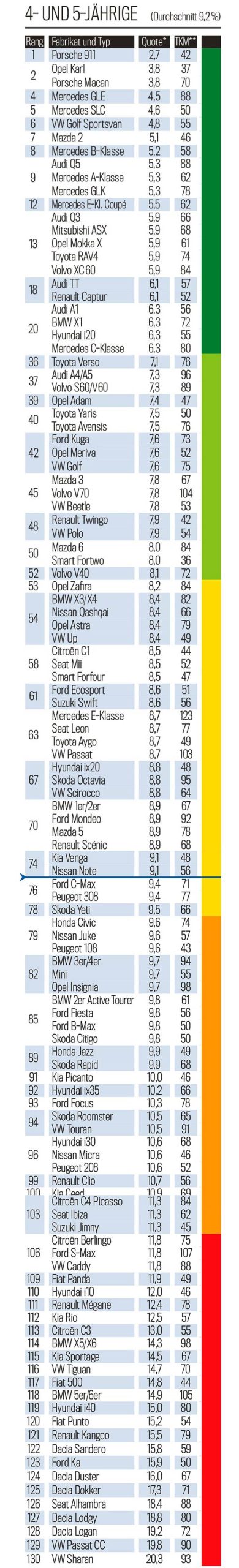 Στην κατηγορία των αυτοκινήτων ηλικίας 4-5 ετών, βλέπουμε ότι στην κατάταξη με τις λιγότερες βλάβες (σκούρο πράσινο χρώμα) βρίσκονται μοντέλα γερμανικών κυρίως εταιρειών και κάποια ελάχιστα «ξένα». Ανάμεσα σε αυτά είναι το Mazda2, το Mitsubishi ASX, το Toyota RAV4, το Renault Captur και το Hyundai i20. Στην κόκκινη περιοχή της κατάταξης και συγκεκριμένα στις τελευταίες θέσεις βρίσκονται τα VW Sharan, VW Passat CC και Dacia Logan, με ποσοστά βλαβών που φτάνουν το 20,3%, 19,8% και 19,2% αντίστοιχα.