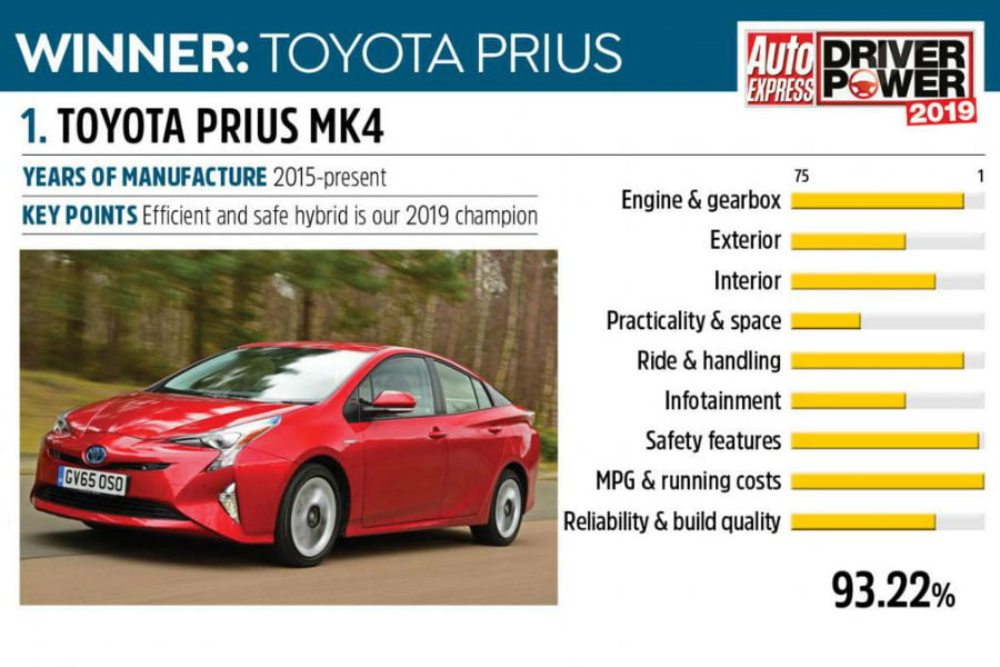 Στην κορυφή συναντάμε το πιο γνωστό υβριδικό του πλανήτη. Τα συστήματα ασφαλείας, η χαμηλή κατανάλωση, η άνεση, ο κινητήρας και το κιβώτιο είναι τα χαρακτηριστικά που εκτιμώνται περισσότερο στο best seller υβριδικό της Toyota. Το ποσοστό εμφάνισης προβλημάτων βρίσκεται στο 14,5%, με την συντριπτική πλειοψηφία να αφορά τα ηλεκτρικά.