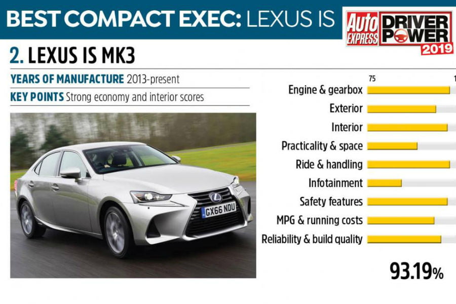 Μια ανάσα πίσω από το Prius, βρέθηκε το μεσαίο της όμορης Lexus. Το IS διαπρέπει στον κινητήρα με το κιβώτιο, την ποιότητα και τον διάκοσμο του εσωτερικού, αλλά και την οδική συμπεριφορά. Μόλις το 4,2% αναφέρει κάποιου είδους ζήτημα, κυρίως στον κινητήρα και τα φρένα.