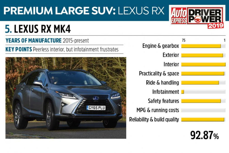 Δεύτερη παρουσία για την Lexus, με το γνωστό SUV της να ξεχωρίζει στο σύνολο των εξεταζόμενων κριτηρίων. Για την ακρίβεια, το RX θα μπορούσε κάλλιστα να βρίσκεται στην κορυφή, αν δεν το «χαντάκωναν» το σύστημα πολυμέσων και το κόστος χρήσης. Από πλευράς αξιοπιστίας, ένα 8,1% αναφέρει ζητήματα κυρίως με τα ηλεκτρικά.