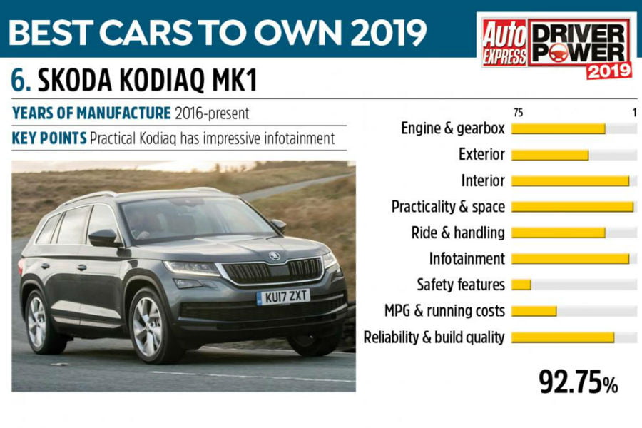 Ακόμα ένα μεγάλο SUV, από την Skoda αυτή την φορά. Το Kodiaq αναμενόμενα κερδίζει άπαντες με τους αχανείς χώρους του, την ποιότητα του εσωτερικού, το σύστημα πολυμέσων και την ποιότητα κατασκευής, ωστόσο τα συστήματα ασφαλείας και το κόστος χρήσης το περιορίζουν στην 6η θέση. Ένα 22,6% και εδώ αντιμετωπίζει, ως επί το πλείστον, ζητήματα με τα ηλεκτρικά.