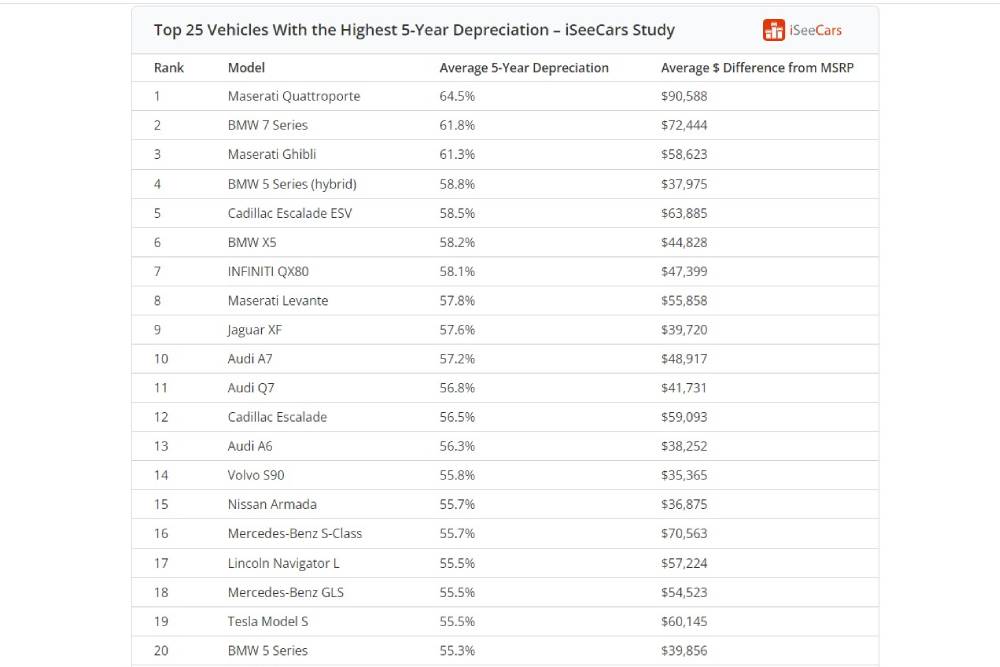 Το iSeeCars ανέλυσε τα δεδομένα της αμερικανικής αγοράς, για πάνω από 1 εκατομμύριο πωλήσεις μεταξύ περσινού Νοεμβρίου και φετινού Οκτώβρη, προκειμένου να δει ποια αυτοκίνητα σημειώνουν τη μεγαλύτερη πτώση τιμής από όταν ήταν καινούργια, σε διάστημα 5 ετών. Αποτελέσματα που δεν μπορούμε να πούμε πως προκαλούν έκπληξη, καθώς 19 από τις 20 πρώτες μάρκες προέρχονται από τα premium κλιμάκια. Εξίσου αναμενόμενη η σχεδόν ολοκληρωτική παρουσία Ευρωπαίων κατασκευαστών, ειδικά του «Big 3» της Γερμανίας, αλλά και της Maserati. Οι 3 από τις 10 θέσεις της πρώτης δεκάδας ανήκουν στην «Τρίαινα», η οποία μάλιστα κάνει και το «1-3».