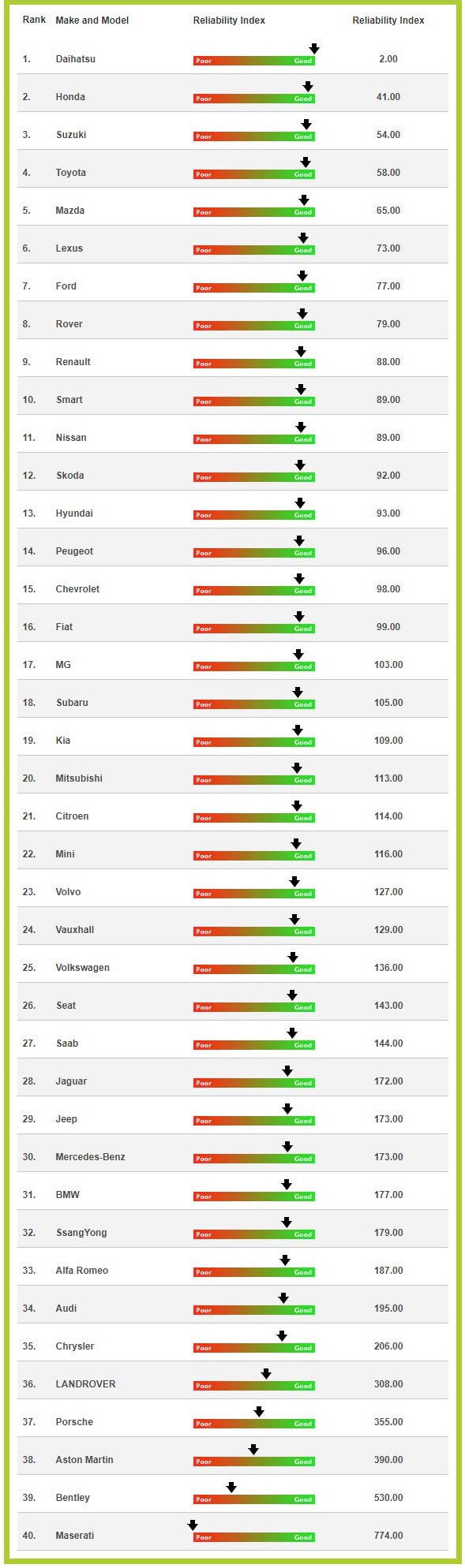 Ακολουθεί παρακάτω η συνολική κατάταξη, όπου ο μέσος όρος είναι το 100. Βλέπουμε ότι στις πρώτες θέσεις με λιγότερα προβλήματα ακολουθούν ιαπωνικές μάρκες (Daihatsu, Honda, Suzuki, Toyota και Mazda), ενώ στο αντίθετο βρίσκονται οι premium κατασκευαστές.