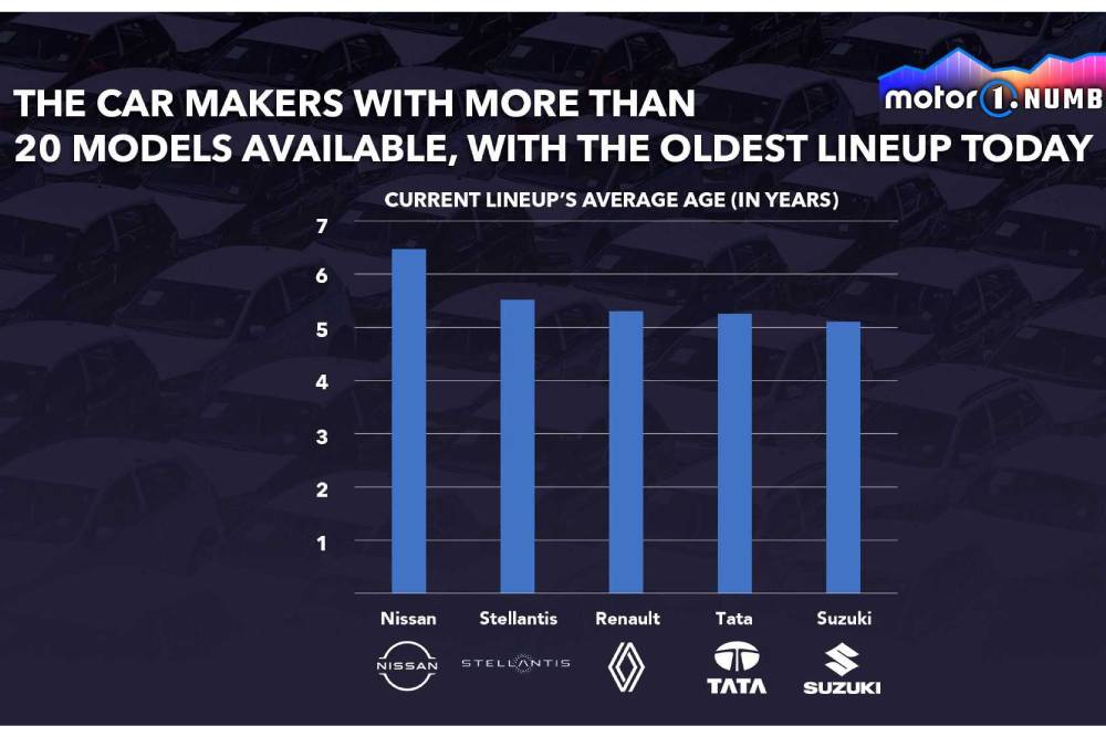 Στους μαζικούς κατασκευαστές τώρα, με τουλάχιστον 20 μοντέλα στις διάφορες αγορές του κόσμου, η Nissan βρίσκεται στην πρώτη θέση με 6,5 χρόνια. Η Stellantis ακολουθεί από απόσταση σχεδόν 1 έτους και ελάχιστα μπροστά από Renault, Tata και Suzuki. Απεναντίας, Honda, Hyundai, Geely, Mercedes και GM προσφέρουν τα πιο «φρέσκα» προϊόντα.