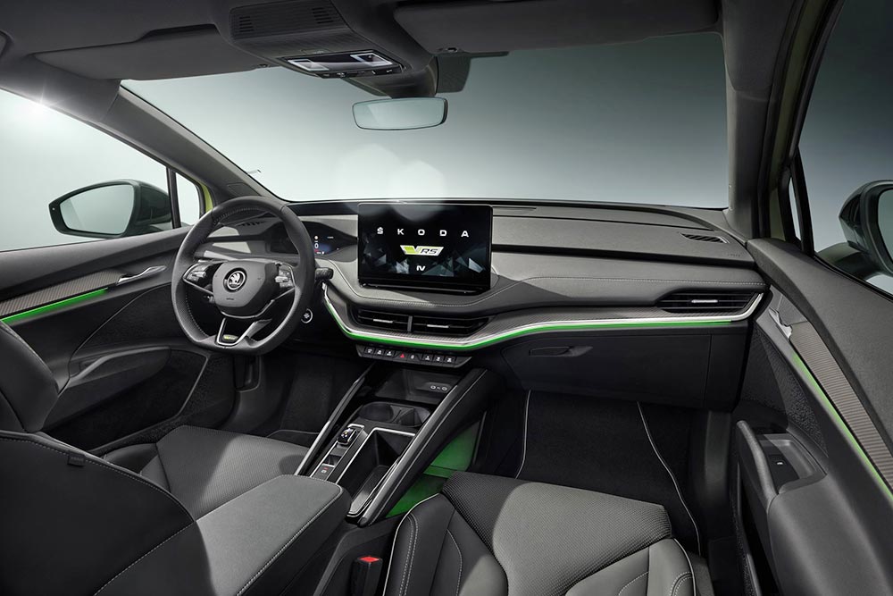 Στο εσωτερικό, η φιλοσοφία Design Selections στο Enyaq Coupe RS iV εκφράζεται με δύο ειδικά σχεδιασμένες επιλογές, τη βασική RS Lounge και την προαιρετική RS Suite. Χαρακτηρίζονται από διακοσμητικές λωρίδες με εφέ από ανθρακονήματα στο ταμπλό και την επένδυση των θυρών, καλύμματα πεντάλ σε σχέδιο αλουμινίου και σπορ καθίσματα με ενσωματωμένα προσκέφαλα και έμβλημα RS, ενώ και το θερμαινόμενο πολυλειτουργικό δερμάτινο σπορ τιμόνι με τρεις ακτίνες διαθέτει σήμα RS. Ανάλογα με την επιλογή τα καθίσματα είναι υπενδεδυμένα με μαύρες μικροΐνες Suedia ή μαύρο διάτρητο δέρμα.